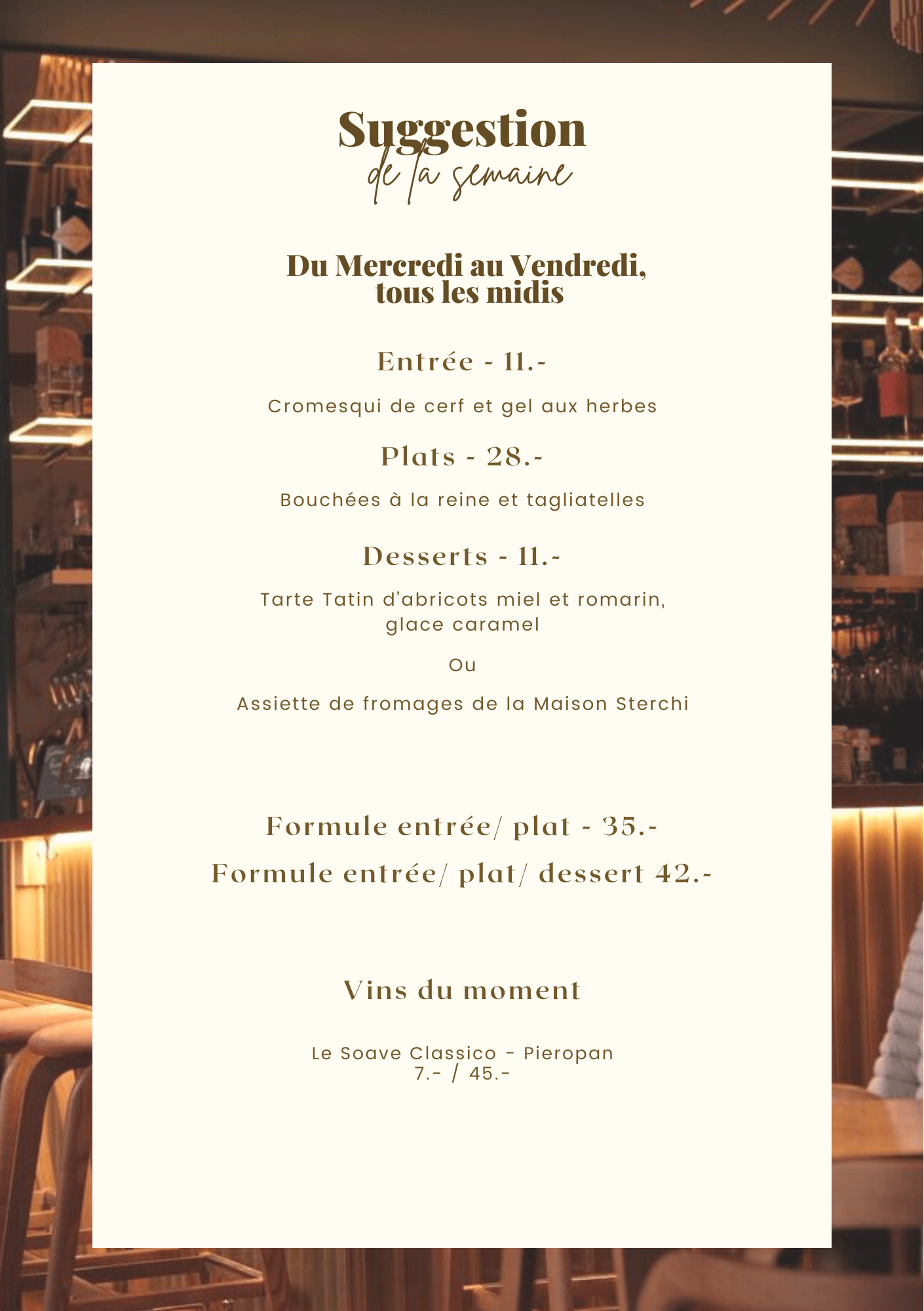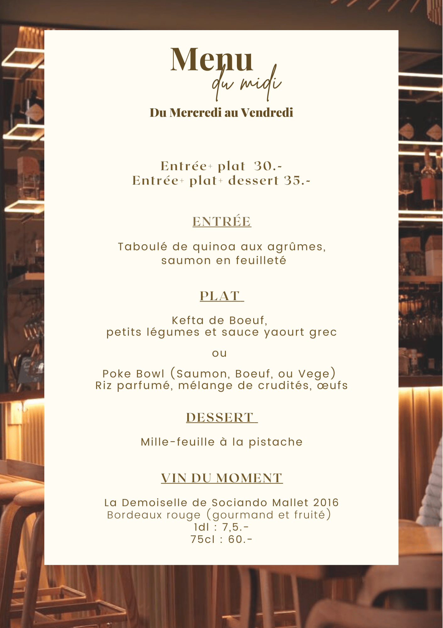Découvrez notre menu de la semaine disponible les midis du mercredi au vendredi.
